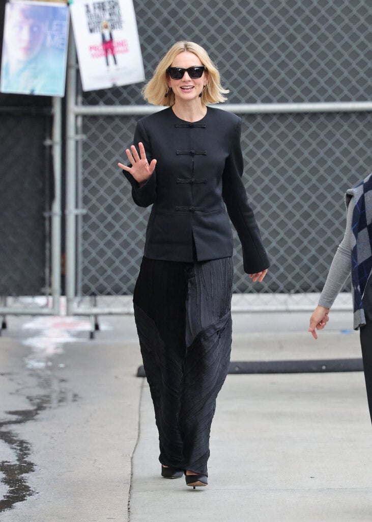 Black patent pumps, a floral cocktail ring, a slicked-back hairdo and studded earrings completed her look.