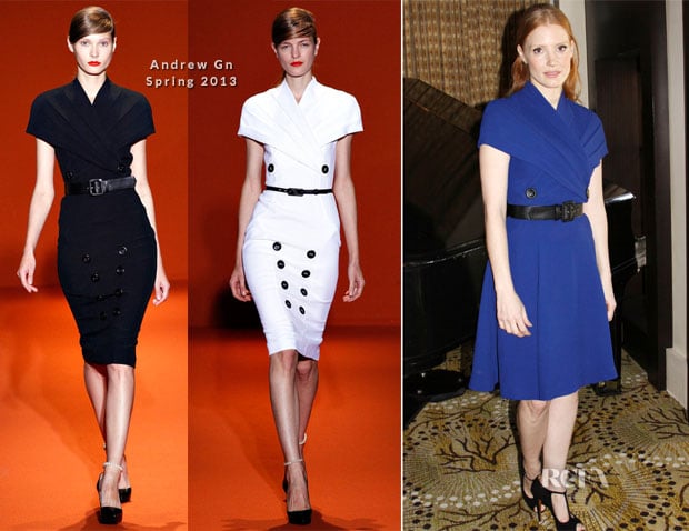 The hardest-working woman in Hollywood wore an Andrew Gn Spring 2013 dress, our first look at this collection on the red carpet.