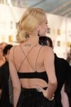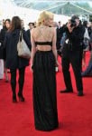 Her black semi-sheer strappy gown with a plunging neckline and featuring a central slit was accented with a leather belt with gold-link accents.