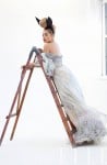 On the second of three covers for Elle magazine’s Women in Music May 2013 issue, Rita Ora wears a textured and feathered Chanel Couture frock – the same Chanel dress we saw recently on Charlotte Casiraghi – with a blossoming headpiece by Ken O’Rourke, black leather gloves and open-toe over-the-knee leather boots.