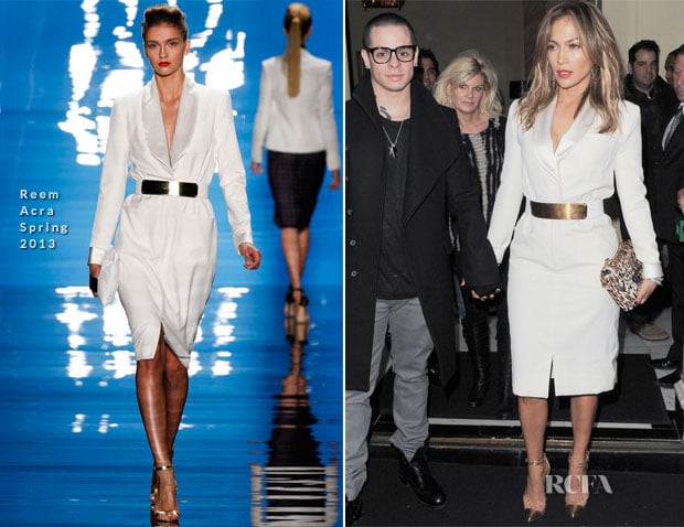 Selecting a white shawl-collar dress with a gold belt from Reem Acra’s Spring 2013 collection, the entertainer was every bit the sleek and sophisticated seductress, as she walked hand-in-hand with her main man, Casper Smart.