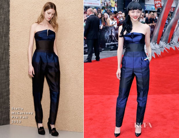 The Asian beauty opted for an edgier look than her fellow female co-star, wearing a Stella McCartney Pre-Fall 2013 strapless blue-and-black-striped tailored jumpsuit.