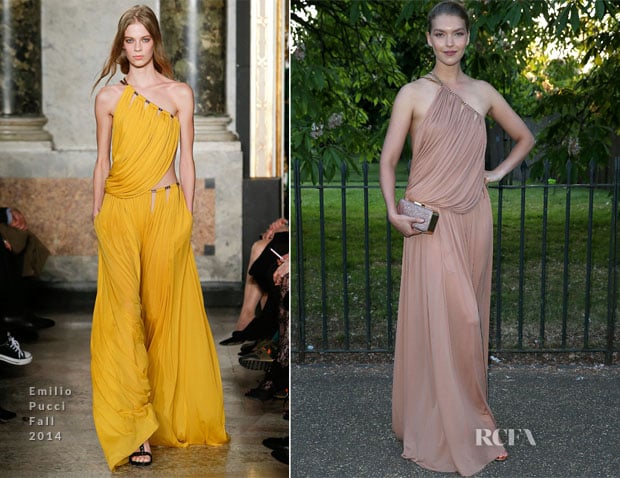 The model looked like a Grecian goddess, wearing an Emilio Pucci Fall 2014 nude asymmetrical gown with gold chain detailing.