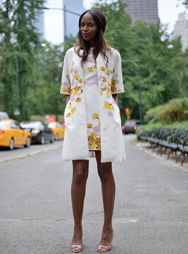She paired the sweet frock with classic nude pumps, a tortoiseshell clutch and a blue silk banded watch.
