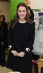 Northside Center: Greeted by the First Lady of New York, Chirlane McCray, who wore Nanette Lepore, Catherine wore a black 60s-style Goat coat edged with beige trim at the neckline, cuffs and back. Styled with tights, a Mulberry clutch and black pumps, the coat is practical, versatile and utterly timeless.
