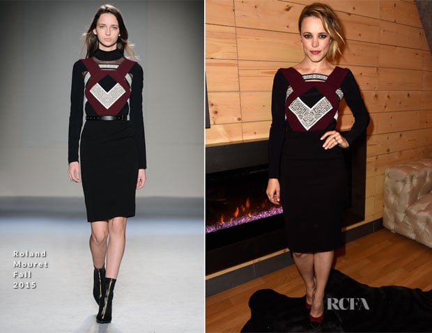 Kristen Bell: Before performing at the ball, the star had a princess moment in a Monique Lhuillier Spring 2015 confection consisting of a blush iridescent dot Chantilly lace evening tunic and strapless tea length dress with full pleated skirt. With the delicacy of the dress, I would have probably opted for less brash accessories, swapping the bright golds for softer tonal hues.