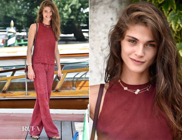 The model/actress wore a Trussardi leather top and suede palazzo pants in warm shades of burgundy, which showcased her effortless, chic style.