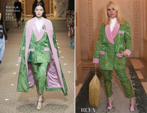 The singer isn’t known to play it safe, so this Dolce & Gabbana Fall 2018 green brocade shawl collar suit with pink trims comes as no surprise.