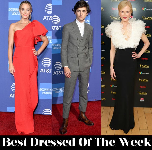 Best Dressed Of The Week Readers’ Choice: Emily Blunt in Roland Mouret and Timothée Chalamet in Thom Browne.