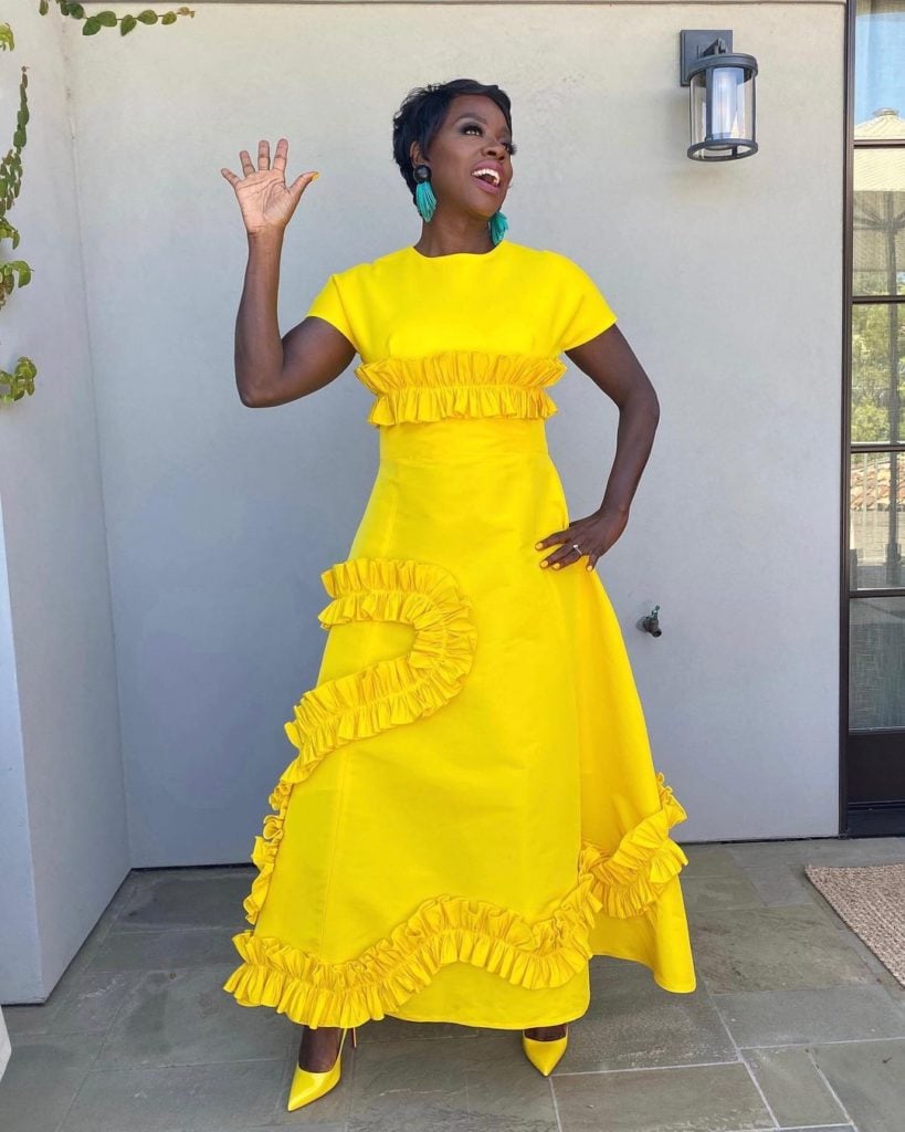Sticking with tailoring, the British actress wore a pink and raspberry set from Gucci’s Pre-Fall 2020 collection.