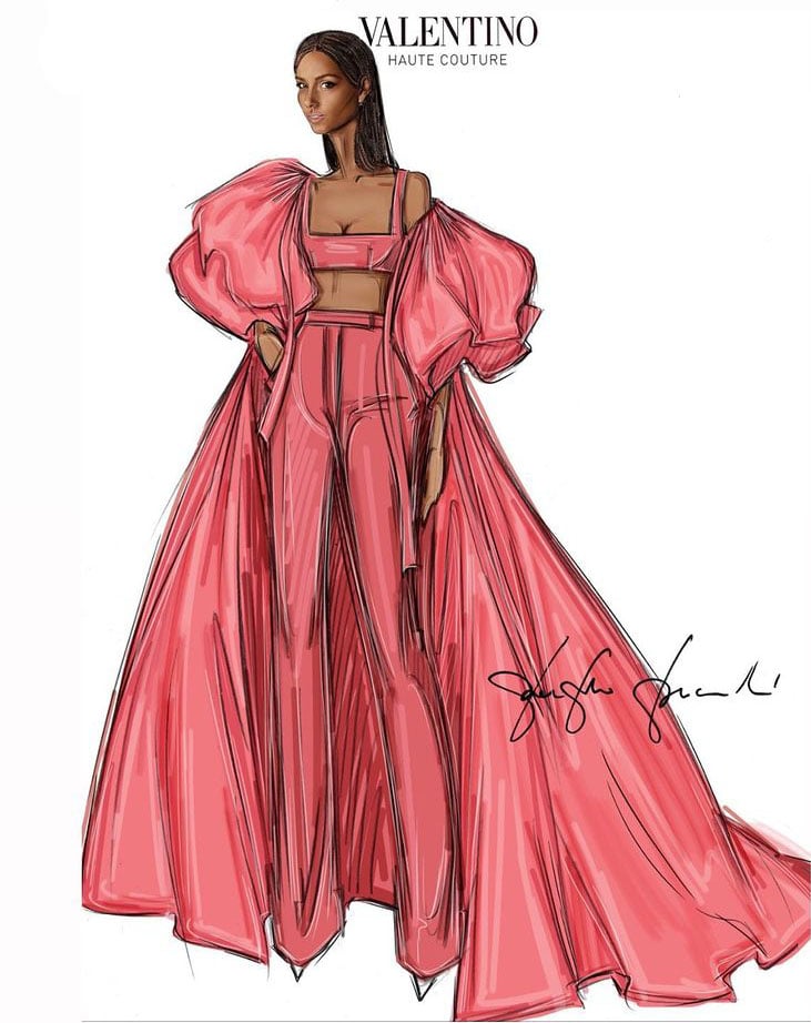 Her first look was a begonia pink silk faille top, trouser and cape combo especially designed for her by Valentino Creative Director, Pierpaolo Piccioli.
