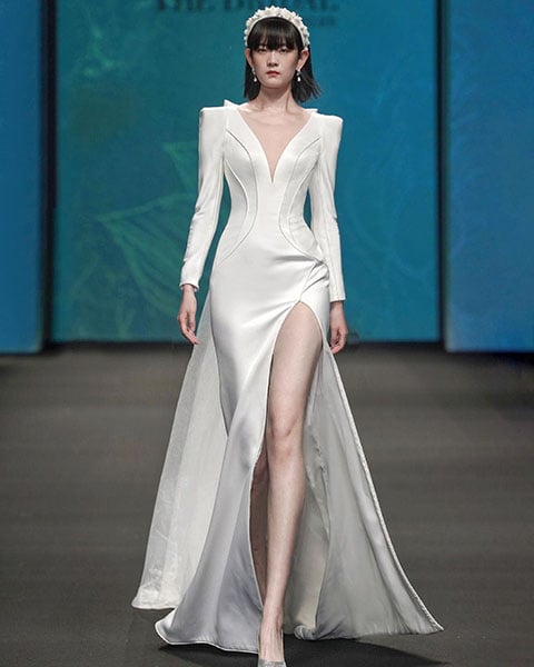 Her dress is actually a bridal dress from The Atelier Couture, which makes for an even more confusing choice, but when you see the bold shoulders, things start to make a bit more sense as Chris Lee and Balmain pagoda shoulders have had quite the love affair.