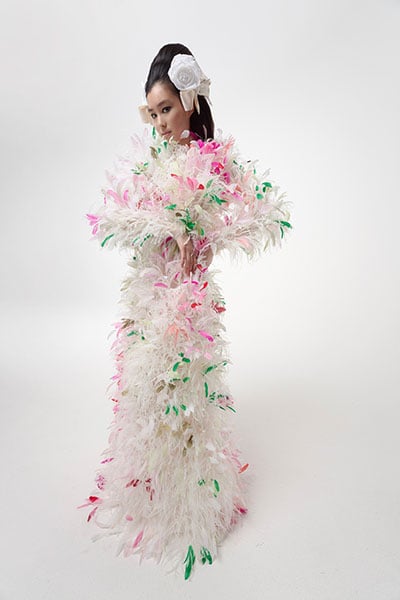 Once again we see feathers flourish while adding dramatic appeal with a trio of colours.