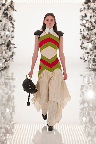 I’m salivating over the accessories – leather shoulder pads sitting outside the dress, and the randomness of the white collar which adds a touch of formality.