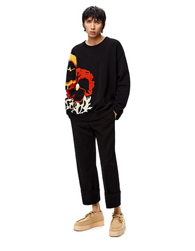 On this occasion he was oozing his usual approachable charm wearing a Loewe pansies embroidered sweatshirt, styled with Loewe drill pants and Loewe wedge lace ups from the Fall 2021 collection.
