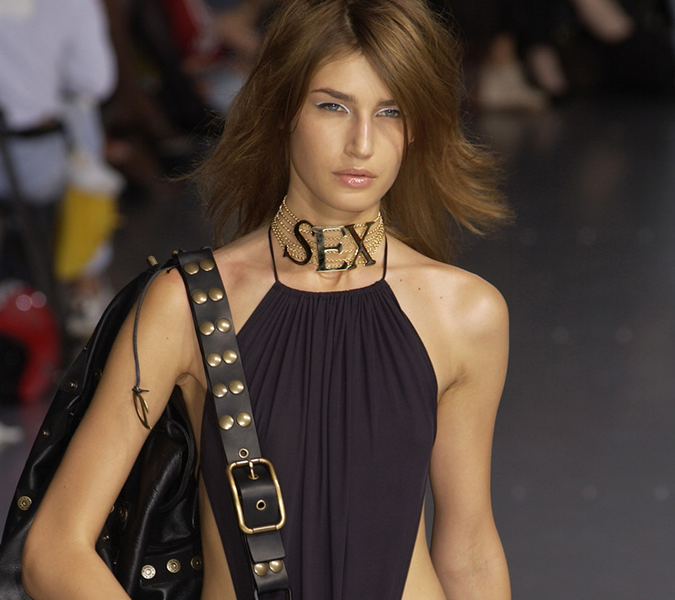 She brought plenty of attitude to the look, which you would need if you’re going to don Dolce & Gabbana’s iconic ‘Sex’ choker which was presented during their Spring 2003 collection.