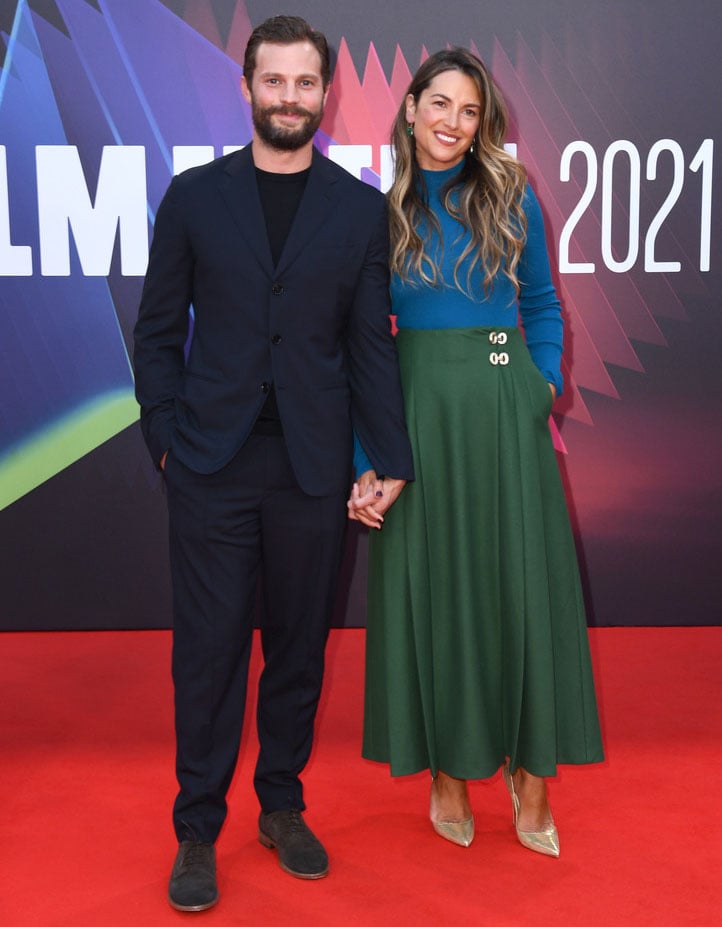 Jamie Dornan wore a Hermes teal blue suit for the ‘Belfast’ London Film Festival premiere, while his wife Amelia Warner complemented his look opting for bolder shades of teal and green while wearing Alberta Ferretti.