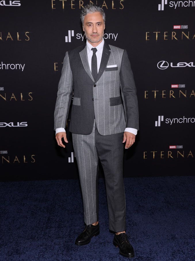 Taika Waititi wore a look to match his personality in this Thom Browne pinstripe funmix suit.