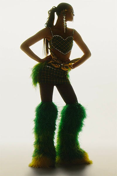 While we are quite familiar with the brand’s love for houndstooth, heart-shapes and crystal embellishments, the feather boots are new.