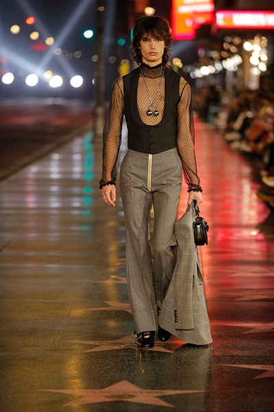 I can just take just about everything else that this Gucci Pre-Fall 2022 look has to offer – the point d’esprit top, the waistcoat, the Prince of Wales check blazer, even those Spider-Man gloves – but those trousers can get in the bin.