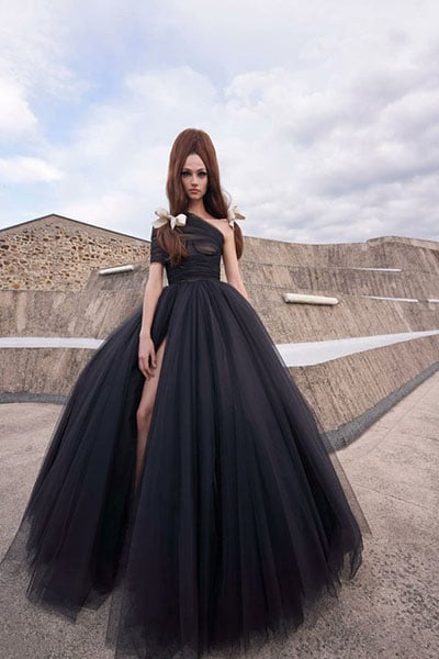 The Cinderella-style tulle dress found some much-needed structure via its sheer strap cut up top, and dainty, understated jewels completed the ensemble.