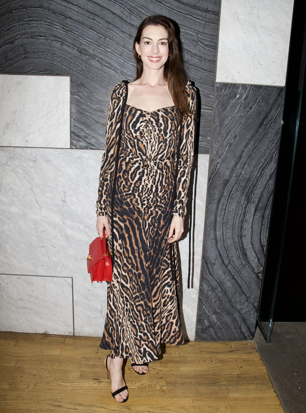 On this occasion she wore a Proenza Schouler leopard crepe de chine dress from the Fall 2022 collection which makes a glamorous statement, especially when styled with her bright red Bvlgari bag.
