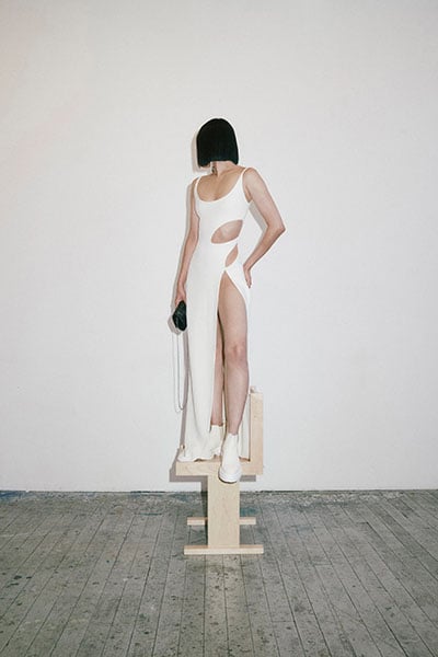 Aurora Perrineau was very much on trend with her Et Ochs Rowena scoop neck high slit gown from the Spring 2022 collection.