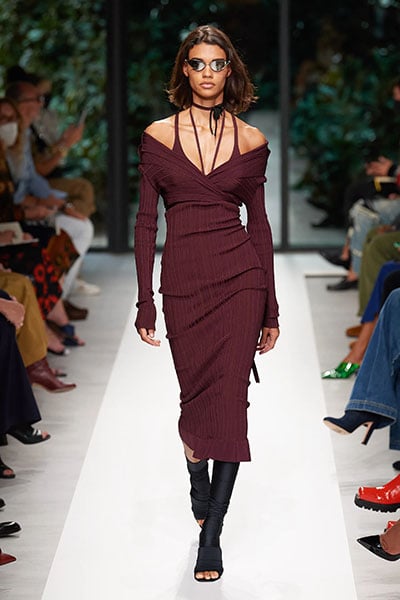 Compared to the other two looks, this Philosophy Di Lorenzo Serafini Spring 2022 burgundy open-back knit dress has more of a minimalist vibe.
