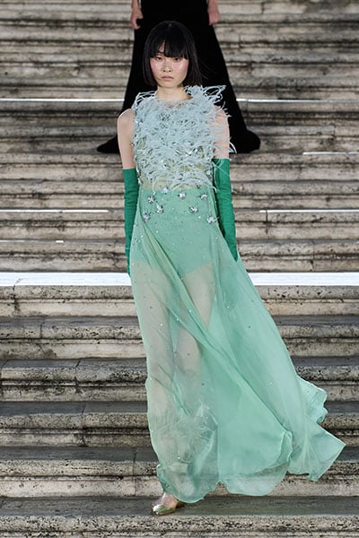 The British actress was as enchanting as ever wearing a Valentino Fall 2022 Haute Couture seafoam green gown accented with feather and crystal accents which was very on brand for her.