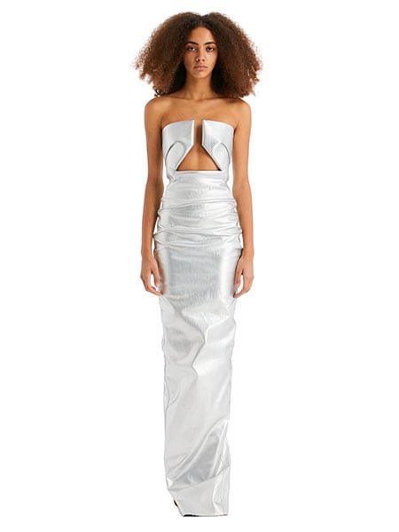 The black version is from the Spring 2022 collection, whereas Kim’s aluminium Rick Owen strobe prong gown is from the Fall 2022 collection.