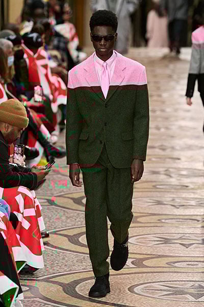 Xolo Mariduena was close to upstaging The Rock wearing this Kenzo Fall 2022 dark khaki and begonia pink colour-block suit.