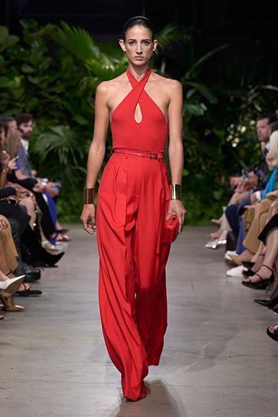 Looking every inch an English Rose, Emily wore a Michael Kors Collection Spring 2023 poppy cashmere halter bodysuit with palazzo pants.