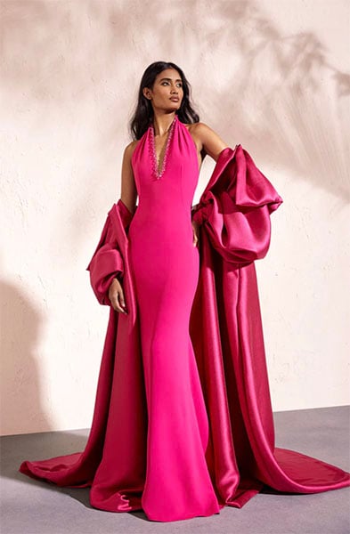 Priyanka looked breath-taking wearing a Pamella Roland magenta crepe halter gown with beaded trim paired with a dramatic magenta silk faille opera coat from the Resort 2023 collection.