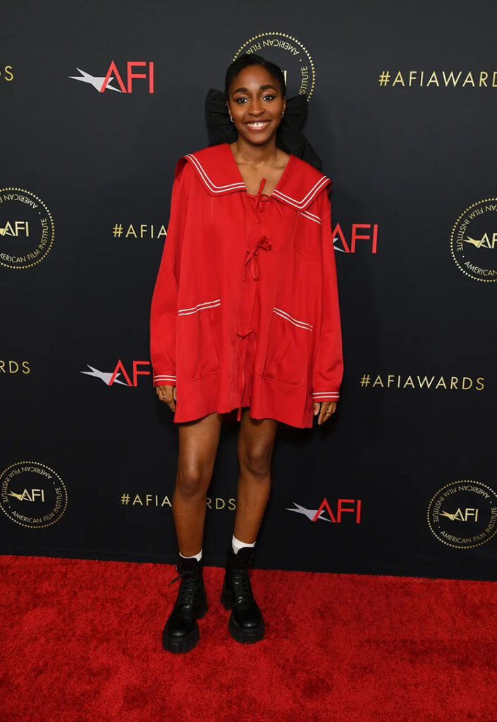 The ‘Bones & All’ actress, who has a fondness for all things black, wore a red Alexander McQueen Pre-Fall 2023 biker jacket and skirt for the occasion.