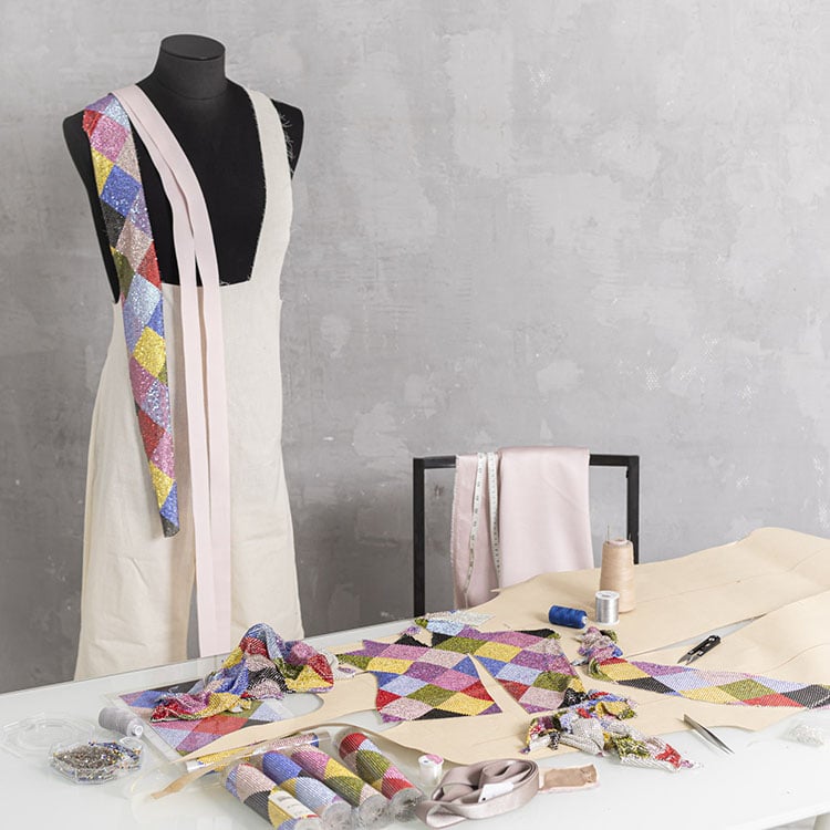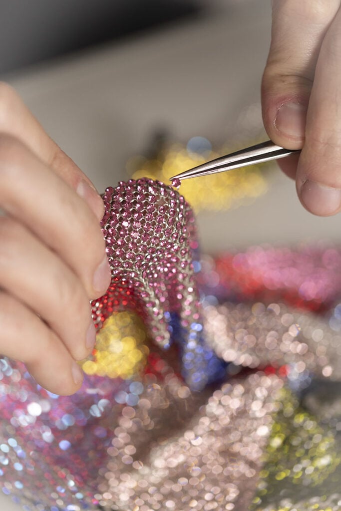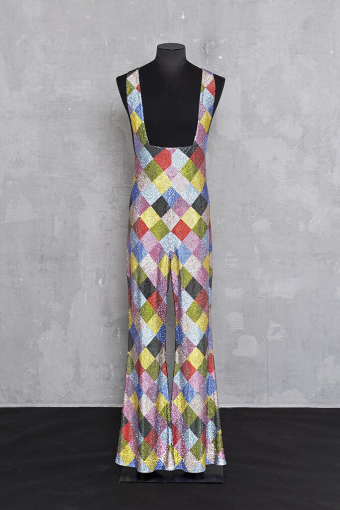 EGONLAB explained, “This unique custom-made piece is a transcription of Harry’s aura and his fearless approach to fashion. The powerful colour combination is a visual metaphor for his personality, his commitment to self-expression and total acceptance. We worked with Swarovski crystals as they seem to come alive as the light dances across their surface in a hypnotic show. It is like a window to another world, a world of pure magic and wonder.”