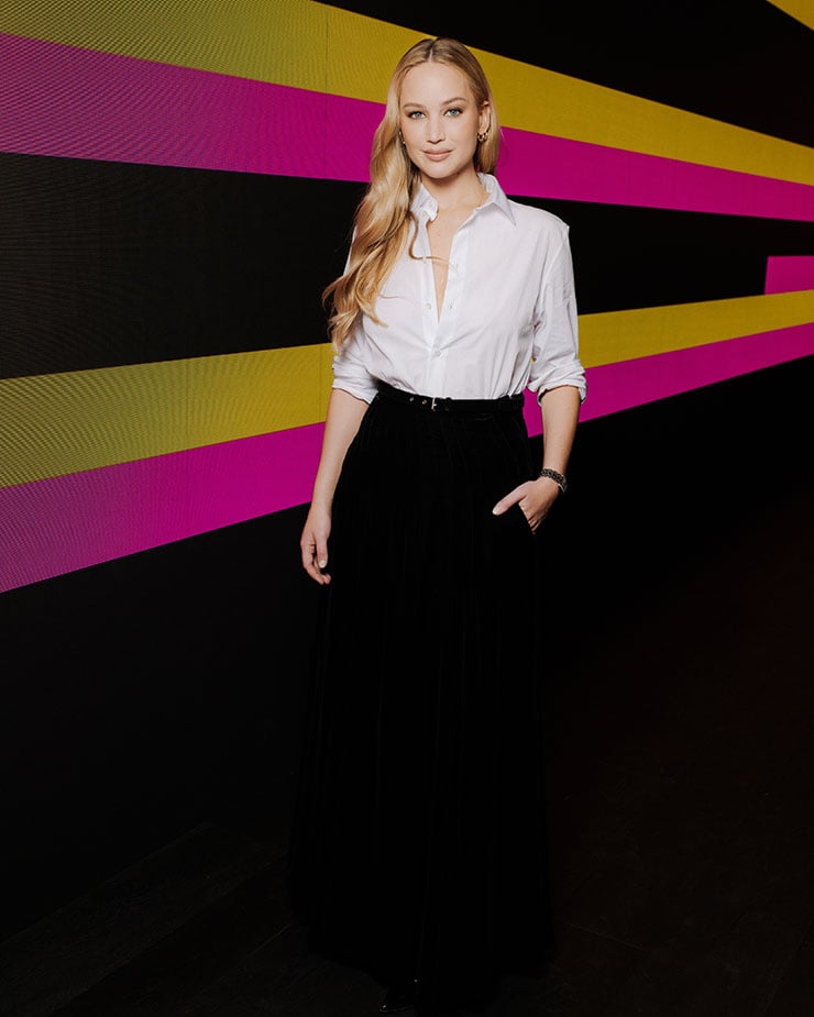 Jennifer Lawrence’s Dior Resort 2024 white cotton shirt and black velvet skirt screamed quiet luxury.