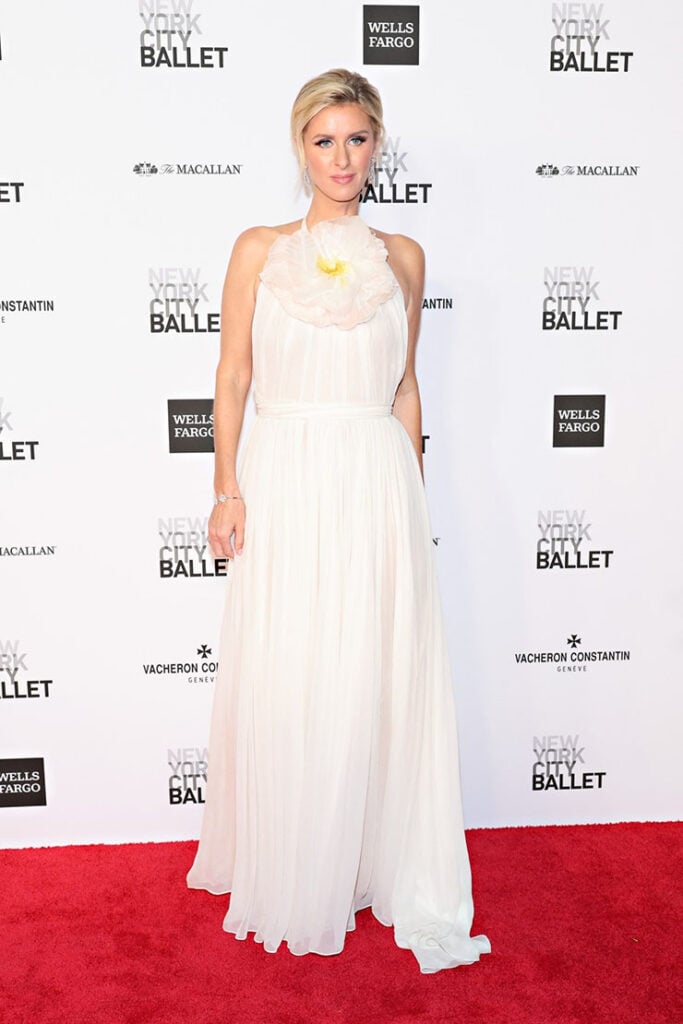 Nicky Hilton Rothschild brought a romantic air to this red carpet wearing an Oscar de la Renta chiffon gown with a delicate flower neckline.