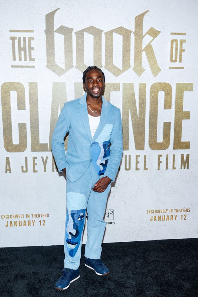 Caleb McLaughlin showcased his fun sense of style at the special screening and Q&A of ‘The Book of Clarence’ wearing KidSuper’s Blue Face corduroy jacket and trousers which both feature a graphic portrait motif for an artistic look.