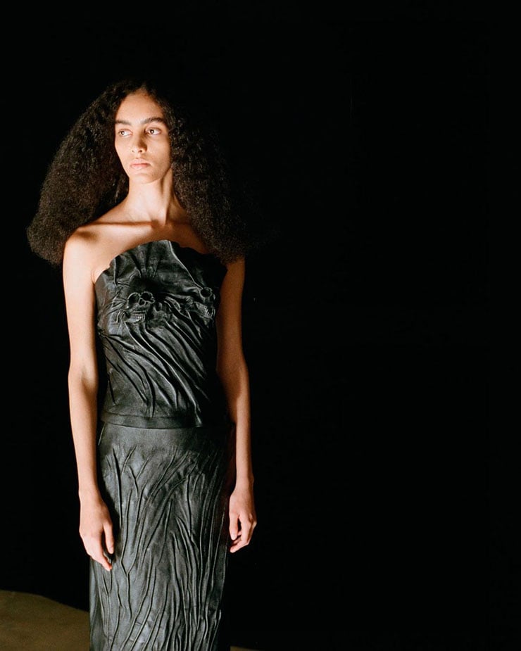 The actress wore a strapless dress from Lurline with a strong textural leather fabrication – reminding me of the print tires leave on tarmac that hasn’t fully dried – which imbues an artistic flair.