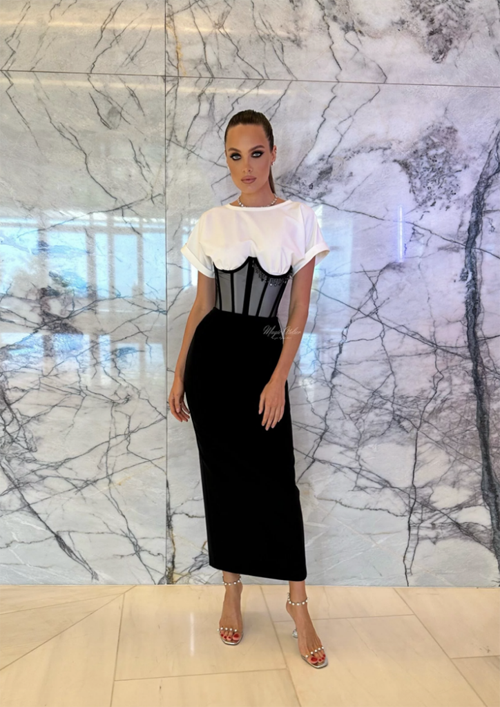 The actress wore a Magic Atelier three-piece look with the exposed, embellished corset adding a touch of glamour to the t-shirt and maxi skirt combo.