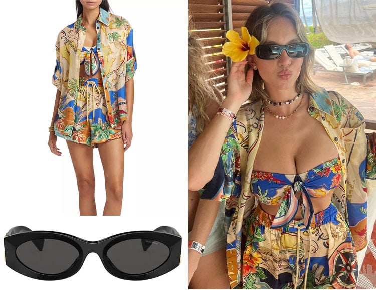 Sydney Sweeney’s Zimmermann Alight Shirt, Shorts, Scarf Tie Two-Piece Swimsuit & Miu Miu Sunglasses
