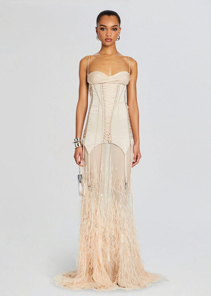 Jodie Turner-Smith, known for her bold fashion choices, wore a Retrofête Lovette silk feather gown with a Laken corset. While her penchant for opulence was evident, the dress was disappointing for someone of her sartorial style, as I found this a little unflattering.