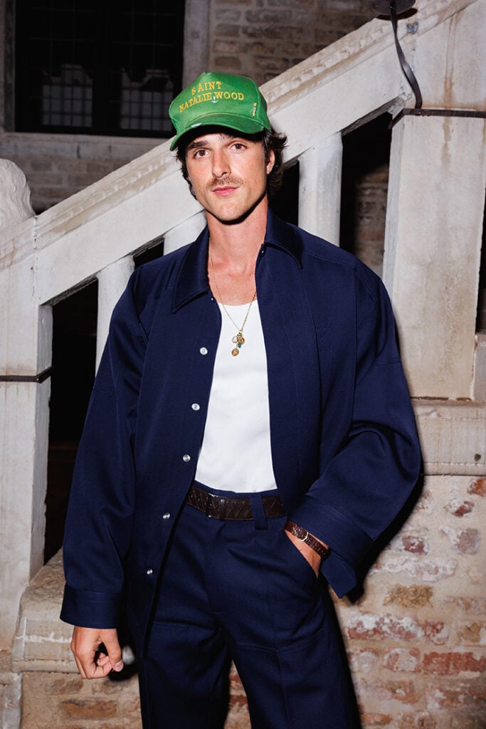 Jacob Elordi kept things cool in a Bottega Veneta Resort 2025 navy shacket and trousers, paired with a crisp white vest. Accessorised with the iconic intrecciato belt and Astair loafers, his look embodied the polished yet relaxed vibe that Bottega Veneta is known for.