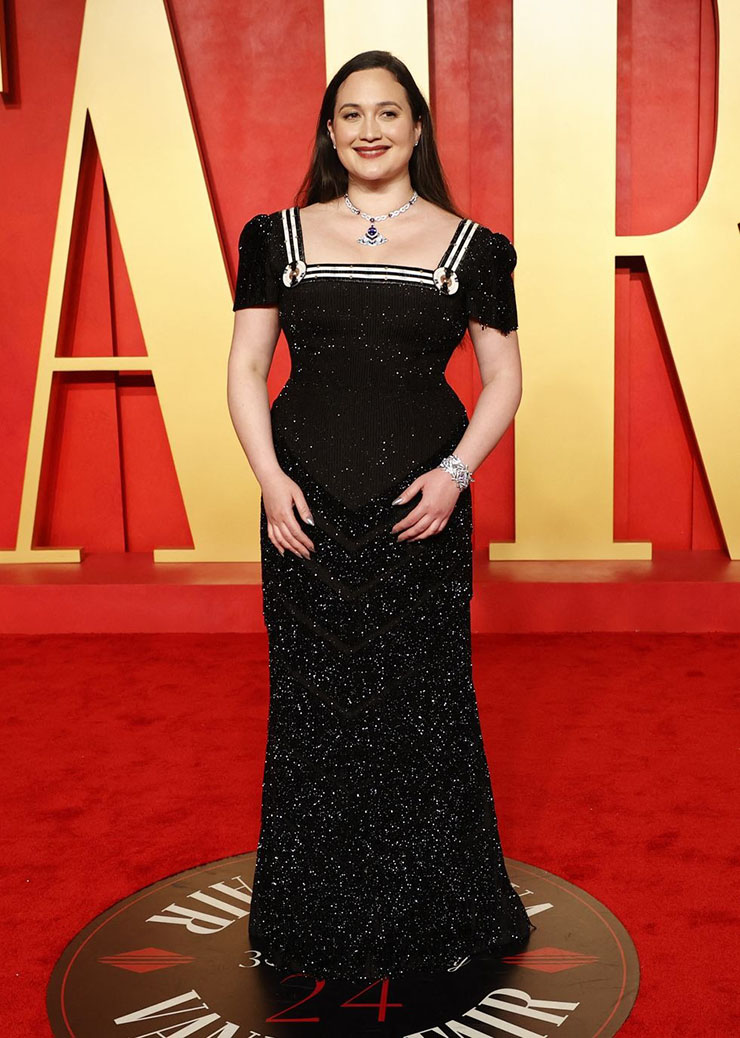 Lily Gladstone opted to rewear her custom Gucci dress, which she previously wore to the 2024 Vanity Fair Oscars Party. The dress was a collaboration with Indigenous designer Joe Big Mountain of Ironhorse Quillwork, and its shimmering graduating chevron beaded fringe details continue to leave me in awe. This was Lily’s farewell to an incredible moment in her life, as the dress will be showcased in the Making a Statement exhibition at the Smithsonian’s National Museum of the American Indian in Washington, D.C., at the end of this month.