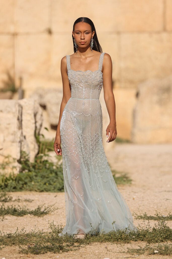 Jackie Tohn opted for a light celeste blue Georges Hobeika tulle gown with scalloped beaded motif detailing from the Spring 2024 collection. It’s soft, romantic, and exactly the kind of dreamy dress that always finds its place on the red carpet.
