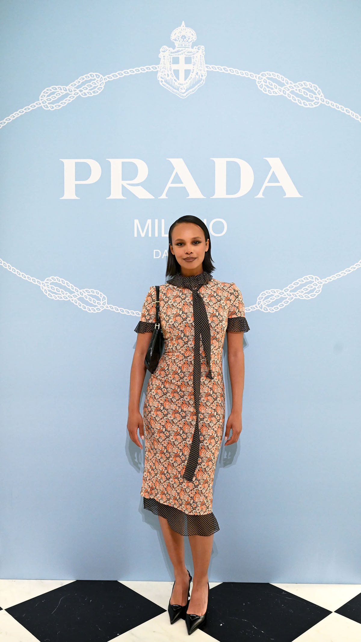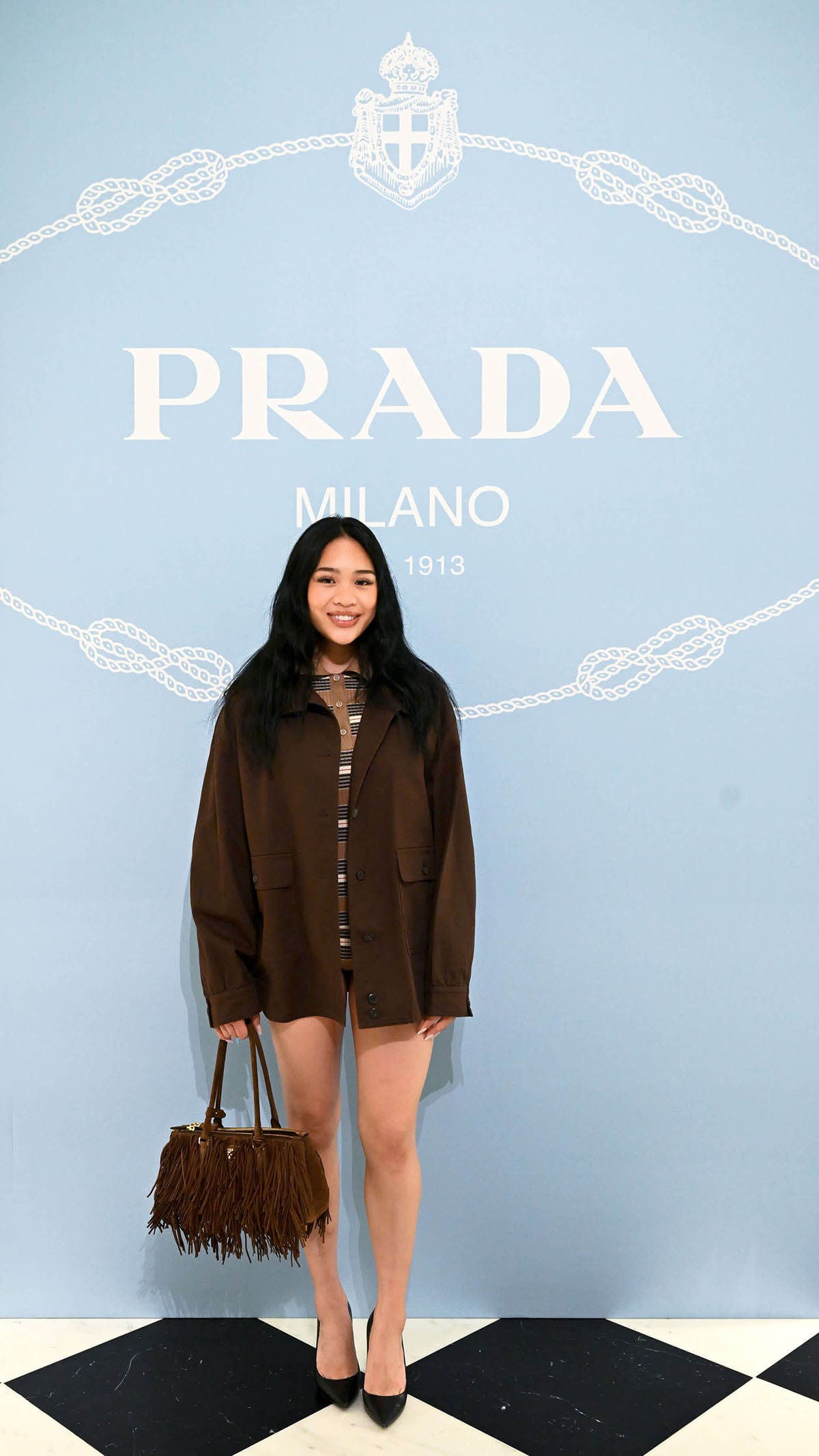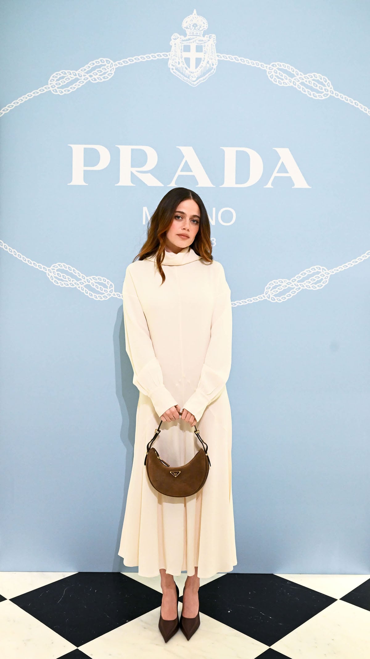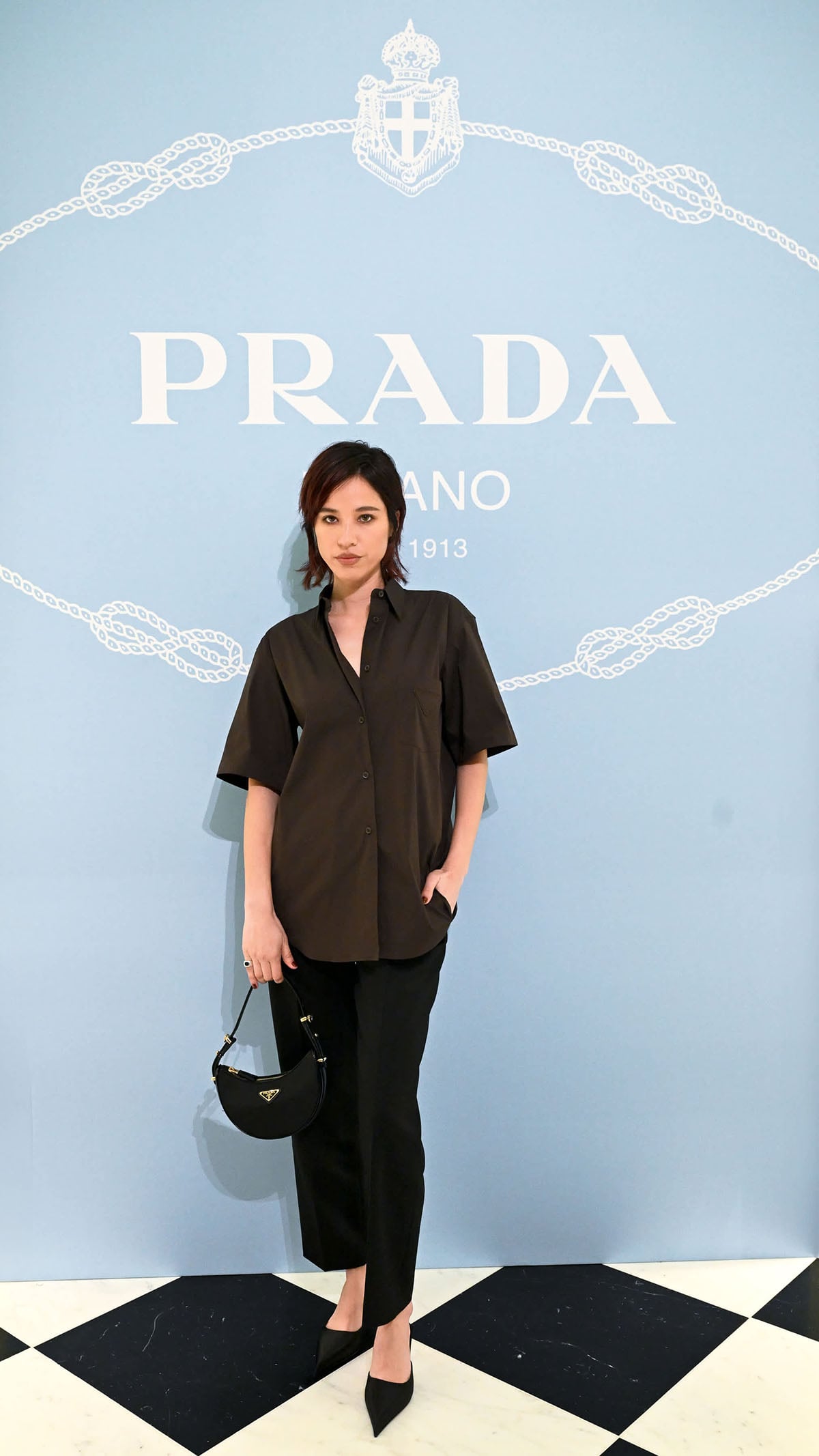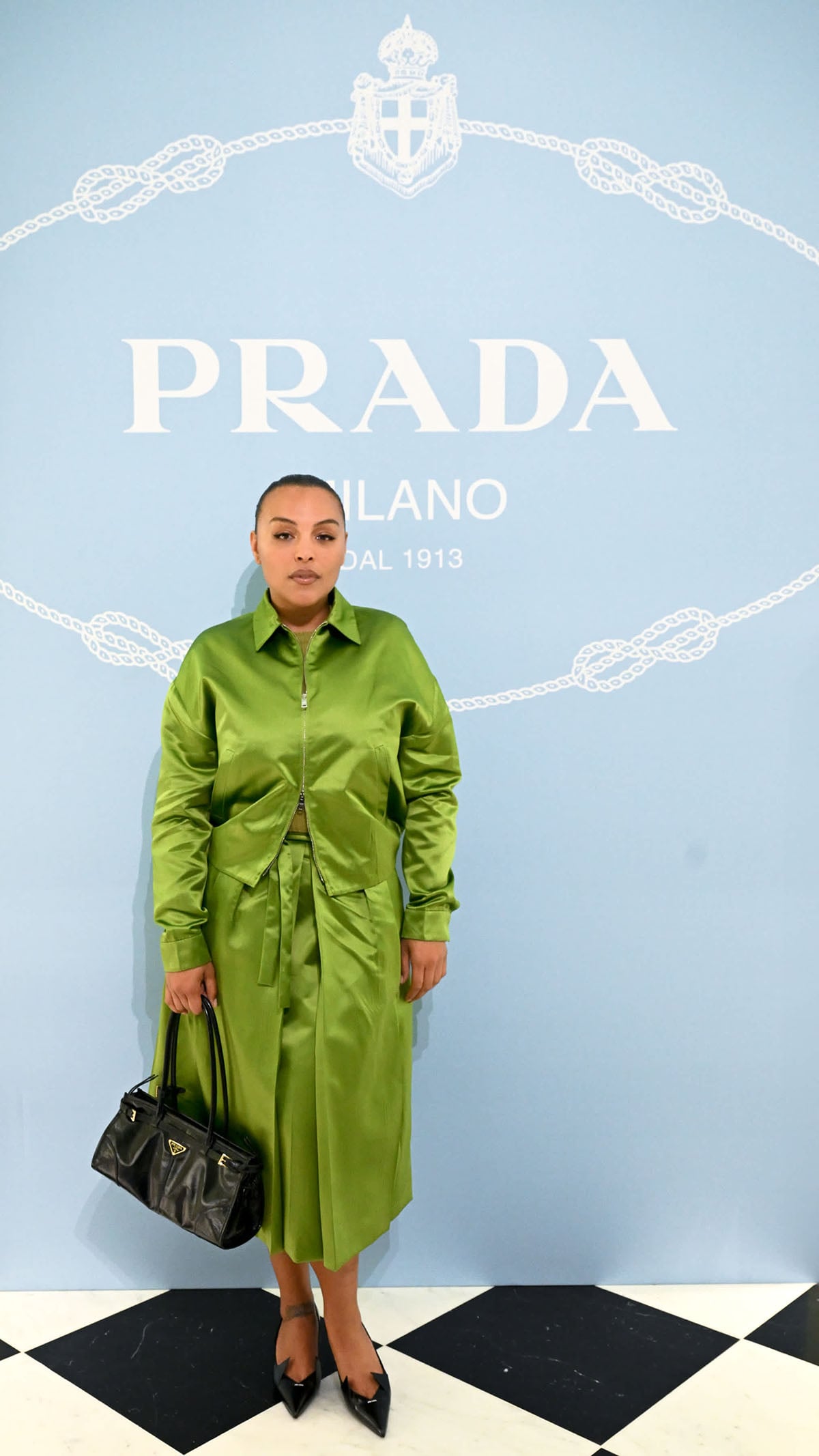 Hunter Schafer leaned into retro sportswear with a Prada track jacket that screamed throwback chic. The pencil skirt and the structured Prada Carey leather bag may feel like a curveball, but I loved how they challenged the expected.