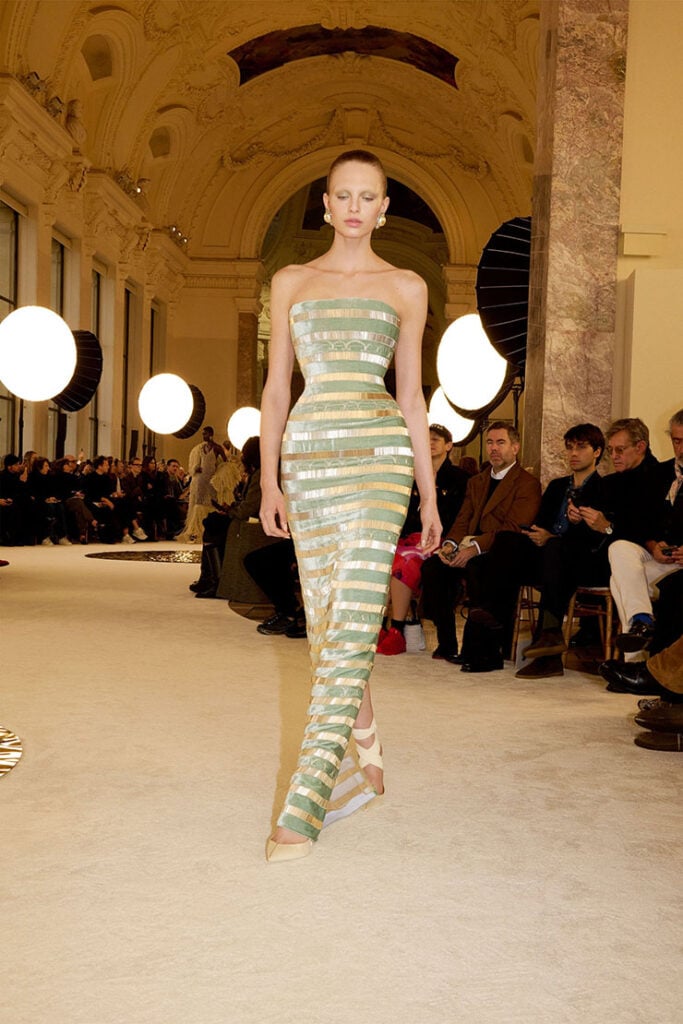 Hunter Schafer was easily my favourite in the lineup, and she didn’t need props or gimmicks to make an impression. Her Schiaparelli Spring 2025 Haute Couture bustier dress, embroidered entirely in bands of celadon velvet and antique silver bugle beads, felt like a study in controlled glamour.