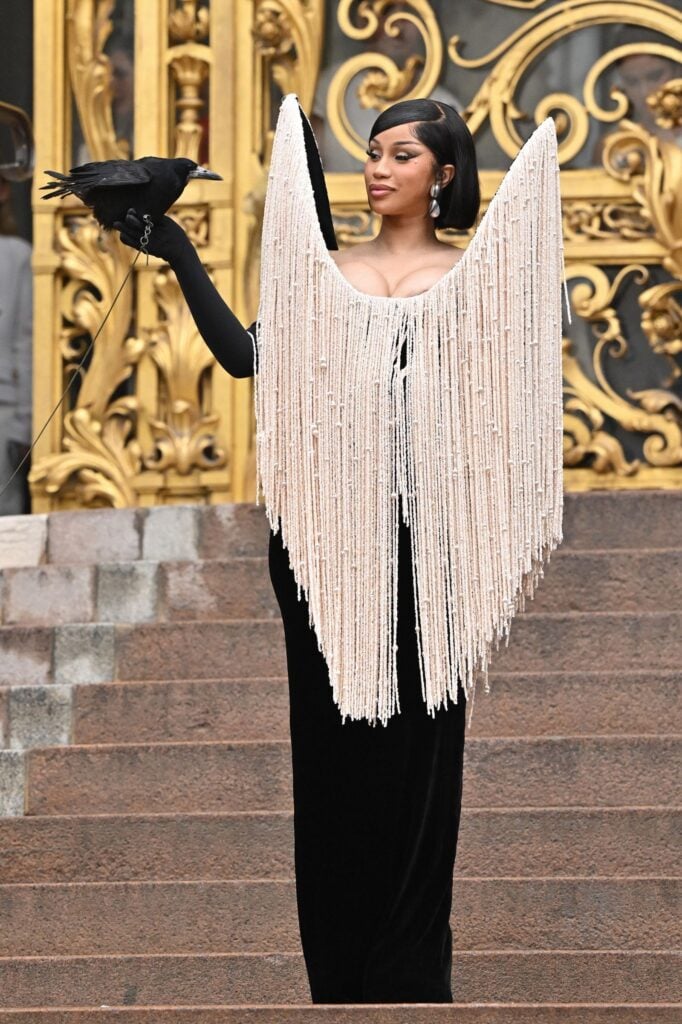 Cardi B, on the other hand, came for the moment. She wore a black velvet Schiaparelli Spring 2024 Haute Couture gown dripping in fringe, pearls, and the house’s signature sculptural shoulders. But the pièce de résistance? She accessorised with a live crow. Yes, an actual bird perched on her arm. While the gown itself was pure drama and didn’t need anything else, Cardi thrives on virality. The crow may have stolen the headlines, but for me, it distracted from what was otherwise a beautifully dramatic couture look that stood strong on its own.