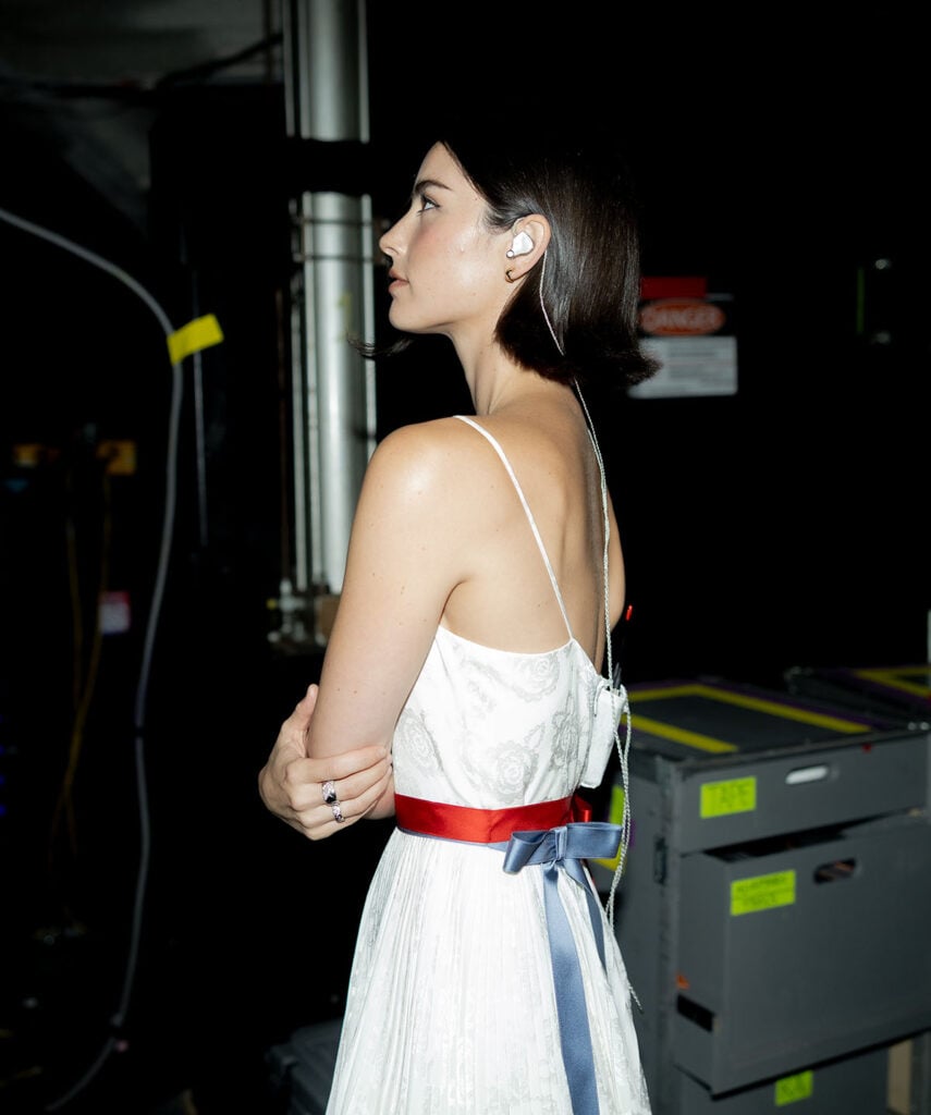 As a Chanel ambassador, this pivot was inevitable—and honestly, she wears the brand so naturally that it never feels forced. For this occasion, Chanel created a custom pleated white satin camelia jacquard dress, finished with a red and blue satin belt that added just enough contrast to break up the softness.