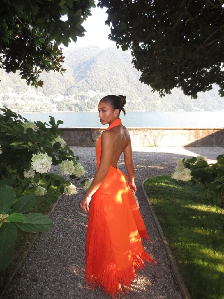 The model and entrepreneur, known for her love of vintage dresses, wore a striking Bottega Veneta Spring 2023 creation that is nothing short of breathtaking. The halterneck gown features a sculpted waist that accentuates her figure before cascading into a dramatic, fringe-covered skirt that seems made for movement. In a vibrant orange hue, the dress perfectly channels Italian Riviera energy — warm, bold, and impossible to ignore.